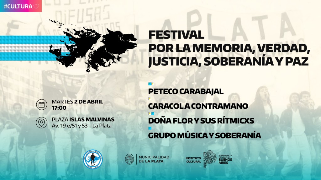 En el marco del Día del Veterano y de los Caídos en la guerra de Malvinas, se realizará el Festival por la Memoria, Verdad, Justicia, Soberanía y Paz, con música en vivo. Todo sucederá el próximo martes 2 de abril, a partir de las 17:00, en la Plaza Islas Malvinas de La Plata. Entrada libre y gratuita.