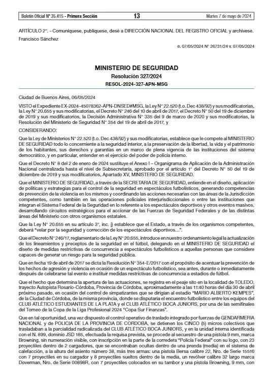 La resolución 327/2024 publicada en el Boletín Oficial, aplica derecho de admisión para 57 barras de Boca.