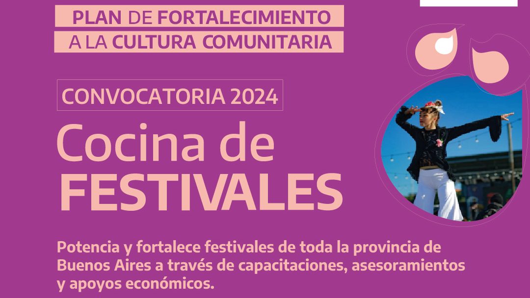 El Instituto Cultural de la Provincia de Buenos Aires abre la segunda etapa del programa Cocina de Festivales, destinado a festivales de gestión no estatal radicados en el territorio bonaerense. Esta convocatoria se da en el marco del Plan de fortalecimiento a la cultura comunitaria, que acompaña diferentes espacios y colectivos, se brinda acompañamiento, asesoramiento y herramientas para el desarrollo cultural en la Provincia.