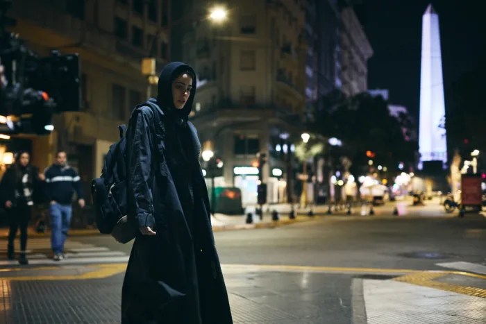 De tapado negro, auriculares, y capucha, las primeras imágenes la muestran caminando por puntos emblemáticos del centro porteño, en Tribunales: de fondo se puede apreciar tanto el Obelisco como el Teatro Colón.